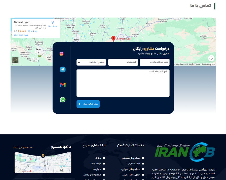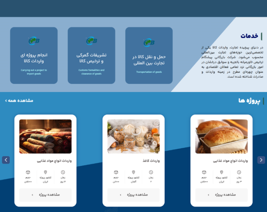 رنگبندی، تایپوگرافی و چیدمان بخشها کاملاً با فضای کاری مجموعه همسو شد تا مخاطب در همان برخورد اول، با یک برند رسمی و مطمئن روبهرو شود. سپس به سراغ معماری محتوا رفتیم. خدمات اصلی مثل ترخیص کالا، مشاوره بازرگانی، ثبت سفارش، حملونقل و امور گمرکی هرکدام در صفحات جداگانه با ساختاری استاندارد معرفی شدند.